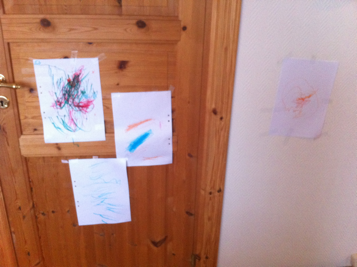 Sonen är inne i en extremt kreativ period just nu där han älskar att skapa, måla och rita. Tejp är också något som fascinerar väldigt mycket så han kombinerar sina två passioner. Mycket och ofta. Han tejpar upp sina alster till allmän beskådan här hemma, så vi är så lyckligt lottade att vi har vårt eget lilla galleri här hemma hos oss.